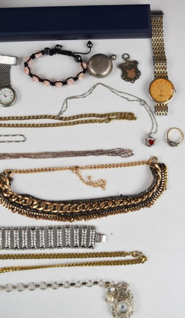 A collection of silver jewellery including ring, two fobs, necklace, bracelet and ring, 10k gold pin (0.5g) etc