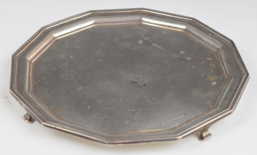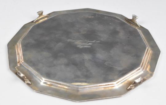 Art Deco hallmarked silver twelve sided salver or tray, raised on four feet, Sheffield 1927, maker Atkin Brothers, width 21cm, weight 377g