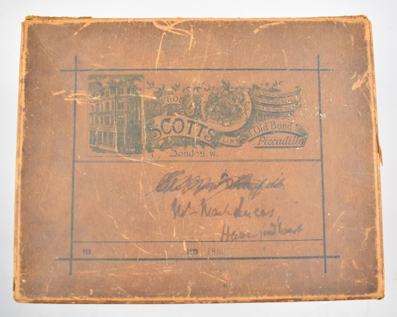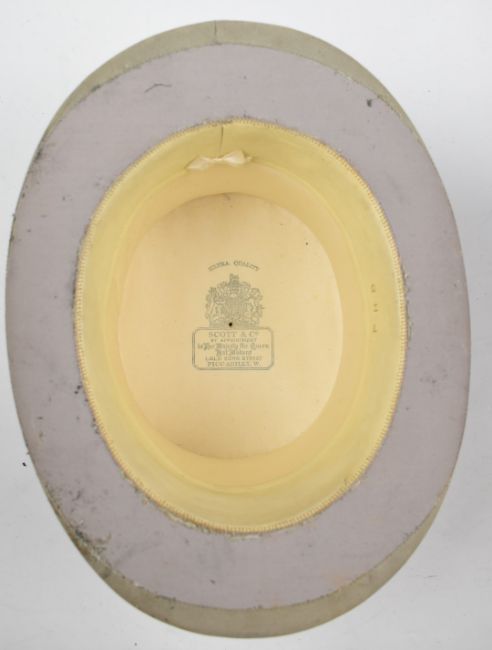 Two vintage grey top hats, one Moss Bros 20 x 16.5cm, the other Scott & Co. 20 x 16cm, together with a Scott cardboard box