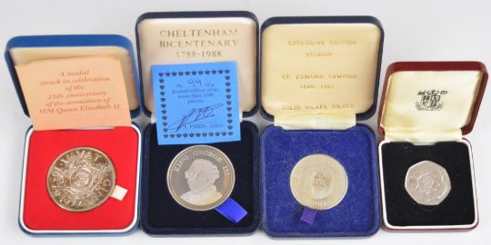 Three crowns including Silver Jubilee 1977 Royal Mint and a silver 1973 50p, all cased, two with certificates
