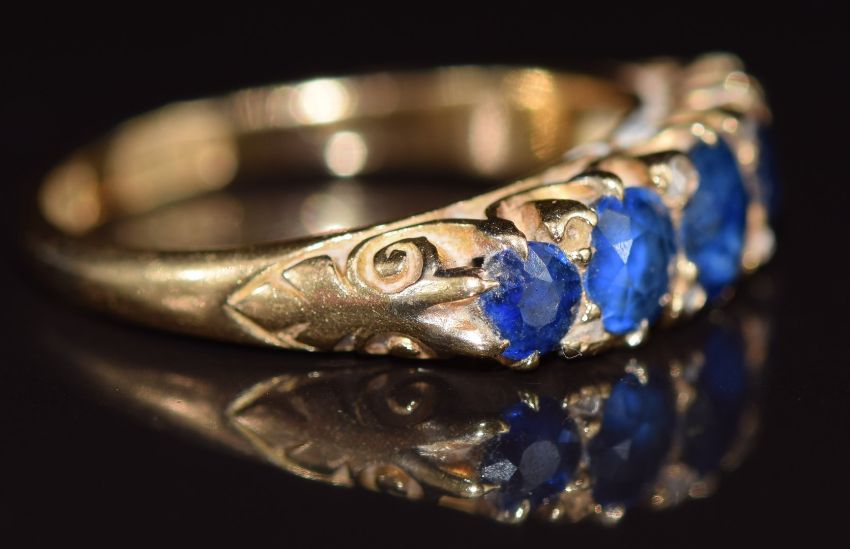 An 18ct gold ring set with five sapphires and rose cut diamonds, Birmingham 1903, 4g, size L