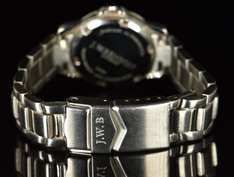 J W Benson wristwatch with date aperture, silver hands and hour markers, white dial, stainless steel case and quartz movement, on stainless steel bracelet, case diameter 26mm, serial number 250.0204, together with four spare links.