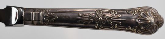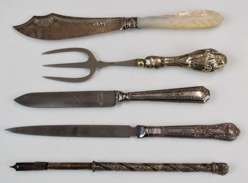 Victorian hallmarked silver and mother of pearl butter knife, Sheffield 1896, maker Joseph Rodgers & Sons, hallmarked silver handled paper knife, further silver handled knife, hallmarked silver handled fork and an Indian or similar pen