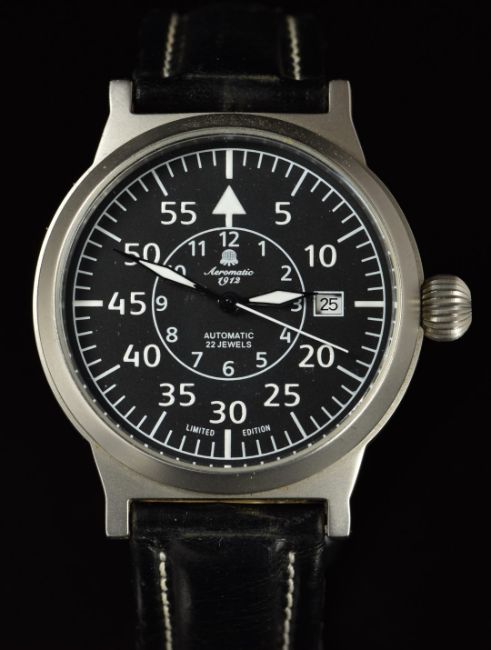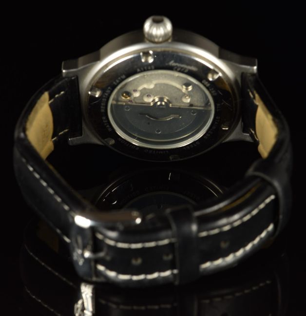 Aeromatic Beobachter Aviator Observer gentleman's automatic wristwatch ref. A1143 with date aperture, luminous hands and Arabic numerals, black dial, stainless steel case, clear exhibition case back and 22 jewel movement, on black leather strap, case diameter 40mm, limited edition 055/250.