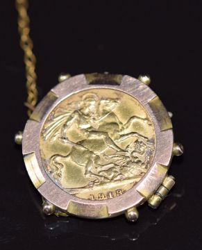 A 1913 gold half sovereign, in 9ct gold brooch mount, 6.3g