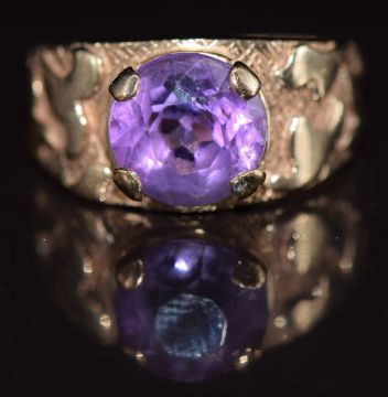 A 9ct gold ring set with a round cut amethyst, with textured shoulders, 4.2g, size E