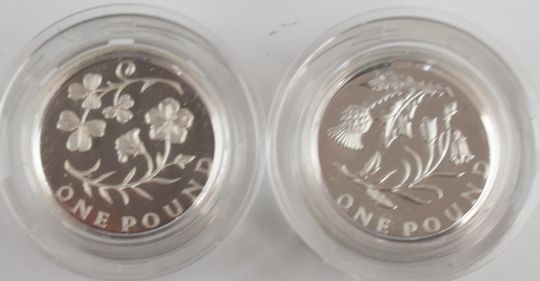 A small collection of coins comprising Royal Mint 2010 silver proof set of five piedforts, cased 2003-2007 set of five silver proof £1 coins, a pair of WW2 50th Anniversary coins with first day covers, a pair of Northern Irish florins and World University Games Canadian dollar, all in cases / displays, some with certificates