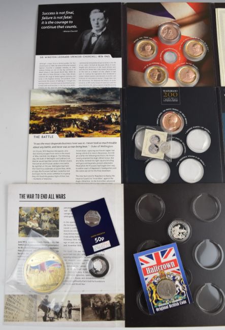 Military related coin presentation packs, London Mint gold plated commemoratives, oversized VE medallion coin etc, together with 23rd June 2016 silver proof Brexit 50p, Stephen Hawking 50p, £5 crowns etc