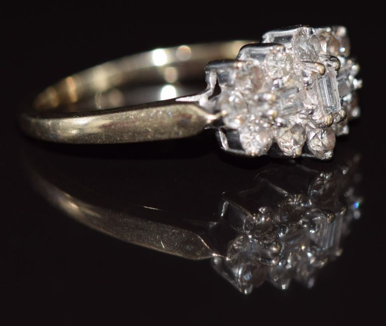 An 18ct white gold ring set with baguette and round cut diamonds in a cluster, 3.9g, size P