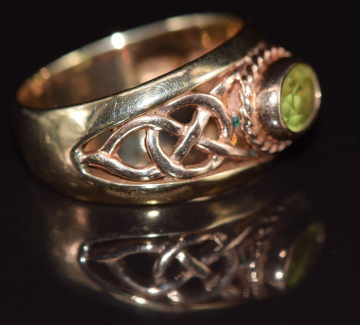 Clogau 9ct gold ring set with peridot with pierced Celtic shoulders, 5.3g, size M