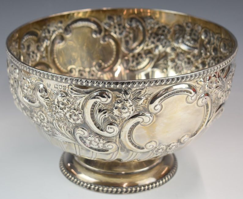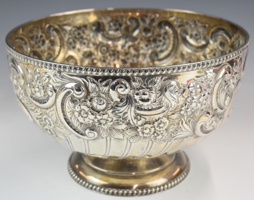 Victorian hallmarked silver pedestal punch bowl with embossed decoration, London 1898, maker William Hutton & Sons Ltd, diameter 26cm, weight 931g