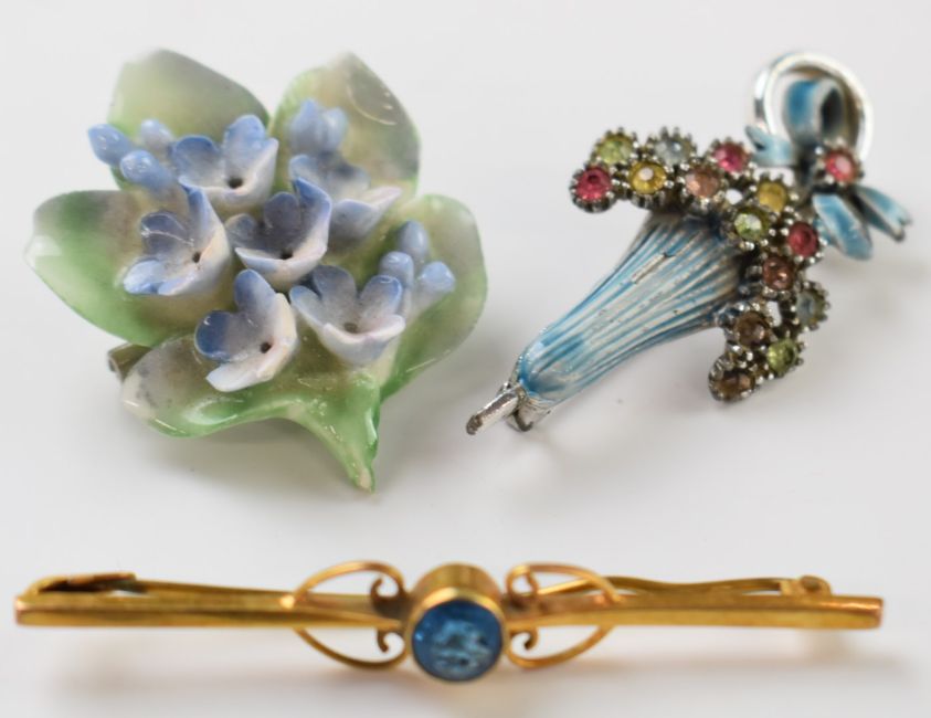 A collection of jewellery including two 9ct gold bar brooches (4.4g), silver, marcasite, carved bone rosary stanhope of Mount Sinai etc