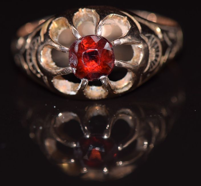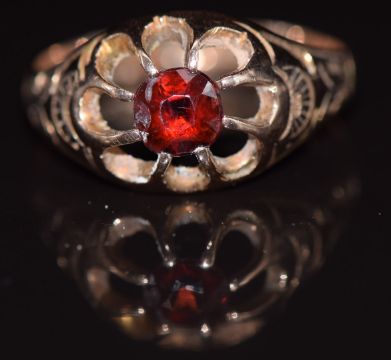 A 9ct gold ring set with a garnet, with engraved shoulders, Birmingham 1919, 2.8g, size M