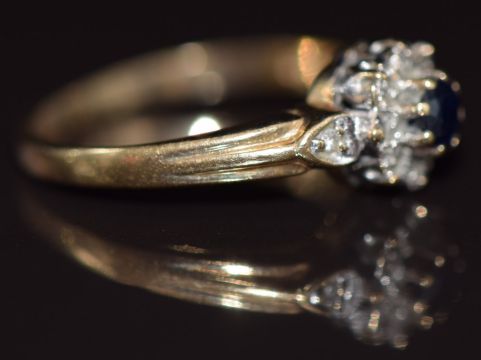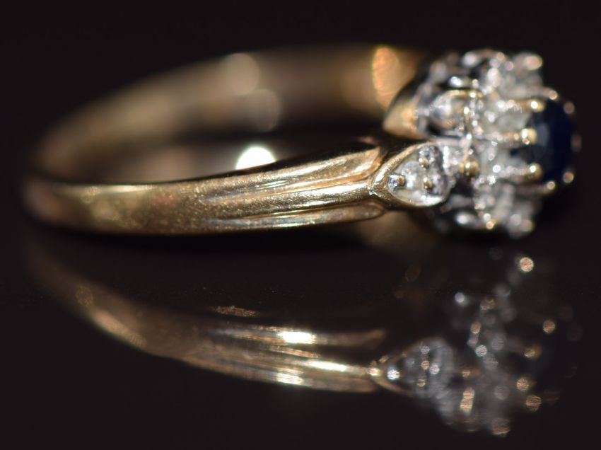 A 9ct gold ring set with a sapphire surrounded by diamonds, 2.3g, size K