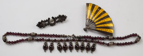 A collection of jewellery including five silver rings, 9ct gold brooch (2.3g), two French jet necklaces, silver bangles, garnet necklace, moonstone brooch, Victorian silver brooch, Norman Hartnell earrings, etc
