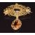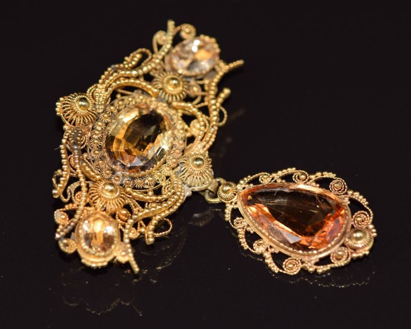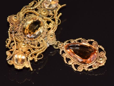 A 19thC filigree brooch set with three oval cut imperial topaz and a drop section set with a further pear cut imperial topaz with filigree surround, 12.1g 5.2x4.7cm