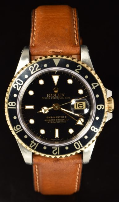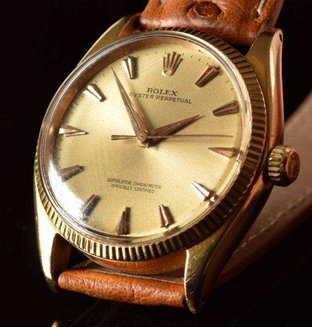 Rolex Oyster Perpetual 18ct gold gentleman's wristwatch ref. 1005 with gold hands, hour markers and dial and signed 25 jewel calibre 1560 movement, on brown ostrich leather strap, case diameter 33mm.