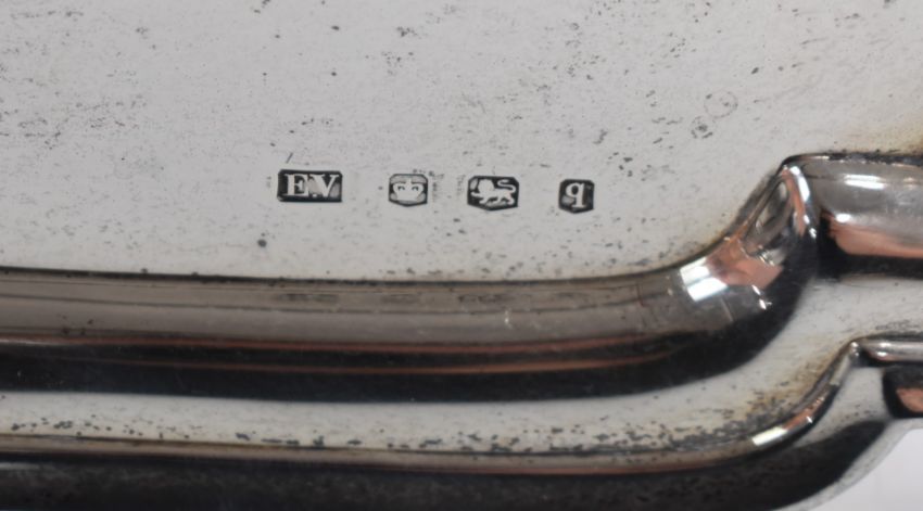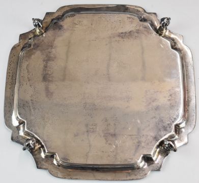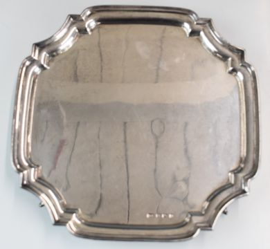 George V hallmarked silver salver with incuse corners, raised on four scroll feet, Sheffield 1933, maker Viner's Ltd, width 27cm, weight 646g