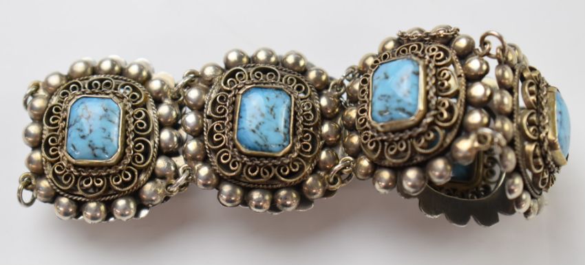 A silver ring and earrings set with Daniel Vior enamel, silver bracelet 800 and two brooches