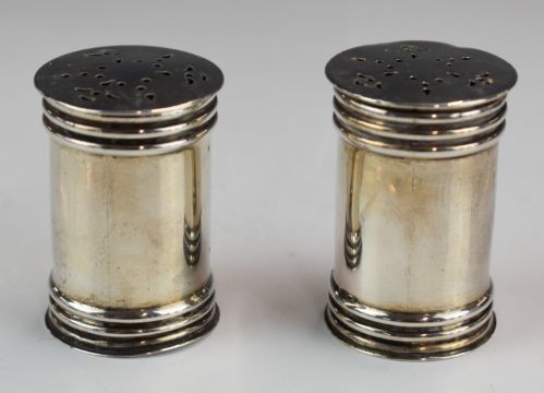 Cased pair of Victorian hallmarked silver peppers, London 1899, maker Horace Woodward & Co Ltd, height 4cm, weight 34g