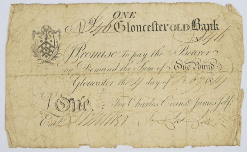 Gloucester Old Bank 1814 provincial Georgian one pound banknote, serial number 46, for Charles Evans & Sir James Jelf, signed by Jelf lower right