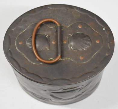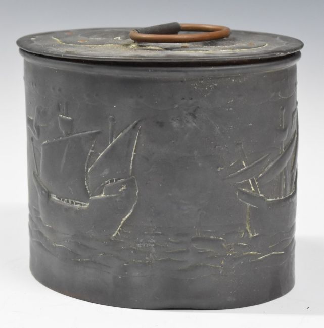 Newlyn School Arts & Crafts oval copper biscuit barrel with repoussé decoration of galleons under sail and whale spouting, the lid with scallops and suspension loop handle, impressed Newlyn to base, W15 x D12 x H12.5cm