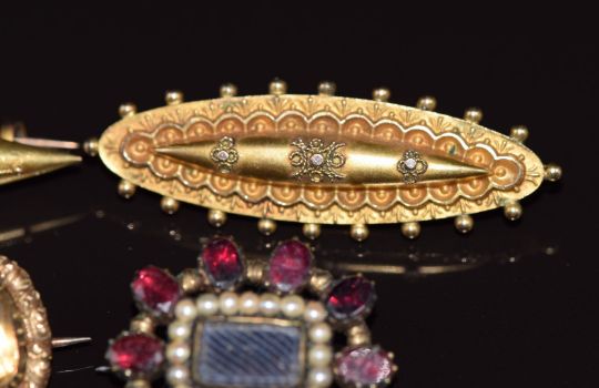 Two Victorian mourning brooches one set with foiled citrine (4g 2x1.7cm) and one with foiled garnets and seed pearls (5g 2.7x2.1cm), an Etruscan Revival 9ct gold brooch (2.7g 4.5cm) and a Victorian yellow metal brooch (4.7g 3.5cm)