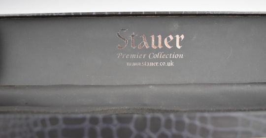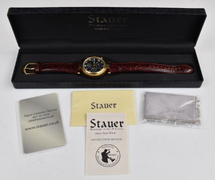Stauer gentleman's automatic triple calendar wristwatch with moonphase, date aperture, day, date and month subsidiary dials, luminous hands and Arabic numerals, black dial, brass case, clear exhibition case back and signed movement, on maroon leather strap, case diameter 44mm, serial number DS 14685, in original box.