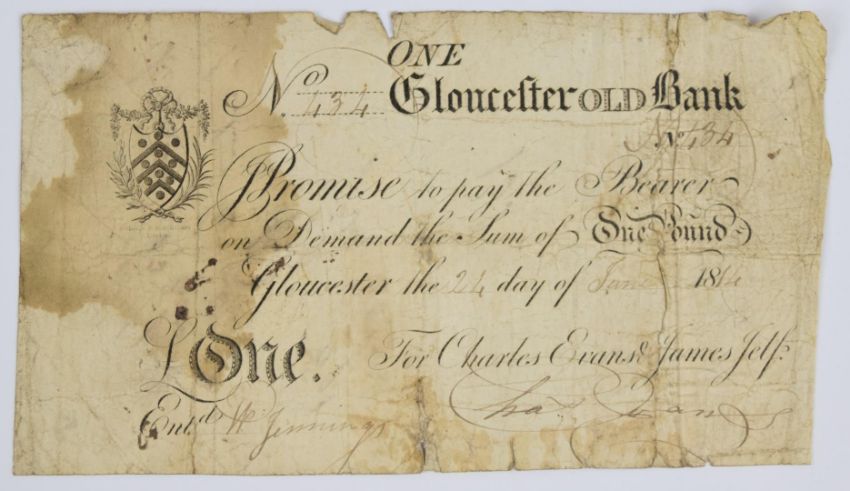 Gloucester Old Bank 1814 provincial Georgian one pound banknote, serial number 434, for Charles Evans & Sir James Jelf, signed by Evans lower right