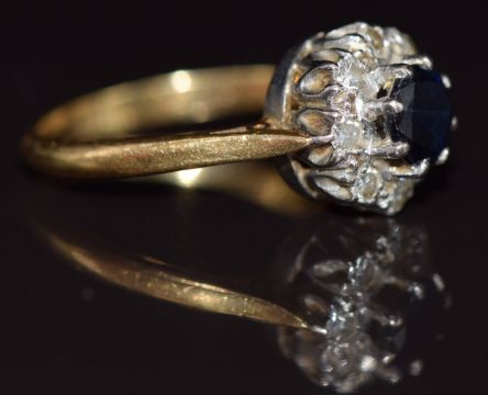 An 18ct gold ring set with a round cut sapphire of approximately 0.7ct surrounded by diamonds, 4.5g, size N