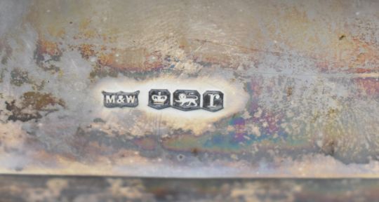Mappin & Webb Art Deco hallmarked silver salver with incuse corners, raised on four scroll feet, Sheffield 1934, width 24.5cm, weight 568g