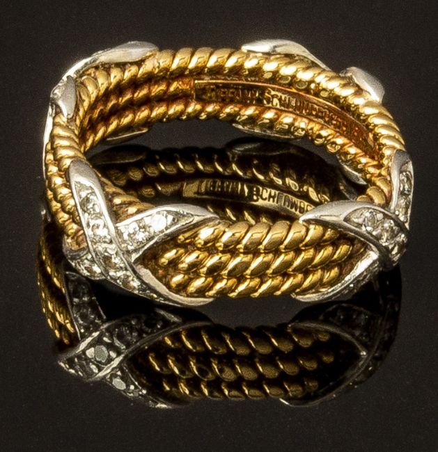 Tiffany 18k gold rope twist ring set with applied white gold crosses set with diamonds, marked 'Tiffany Schlumberger 18k', 5.7g, size K