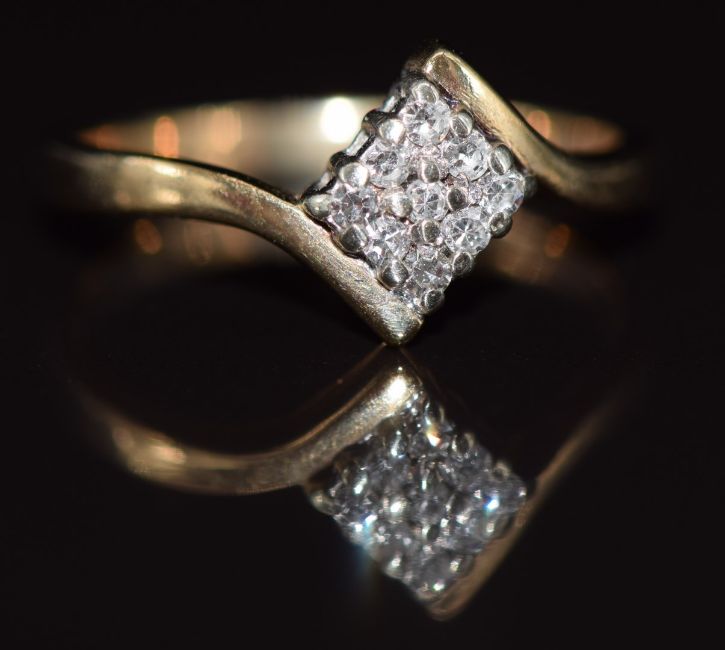 A 9ct gold ring set with diamonds in a square setting, 1.8g, size J