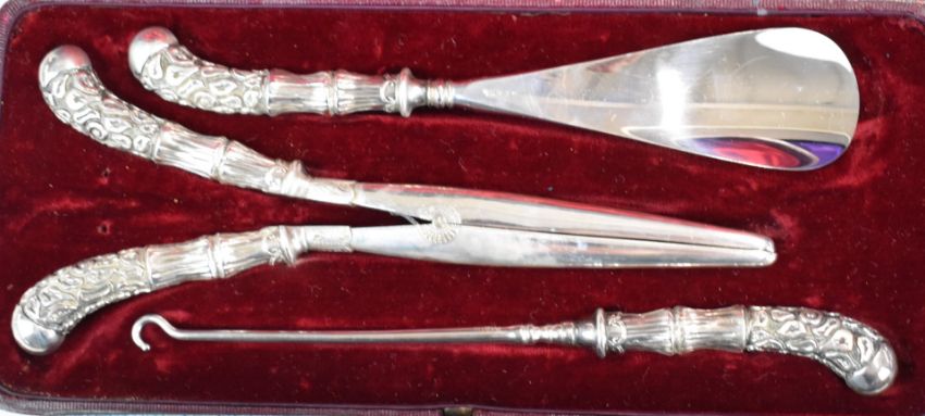 Cased hallmarked silver handled items comprising three dressing table sets and a set of knives, width of longest case 23.5cm