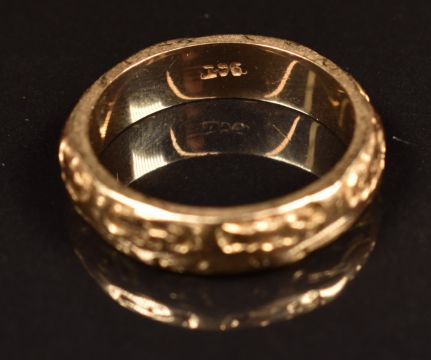 A 9ct gold wedding band / ring with textured decoration, 7.6g, size P