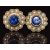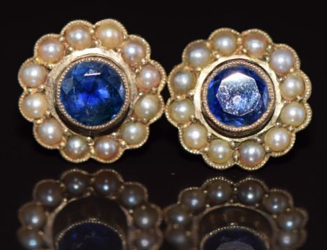 A pair of 9ct gold earrings each set with a round cut sapphire surrounded by pearls, 2g 0.9cm