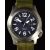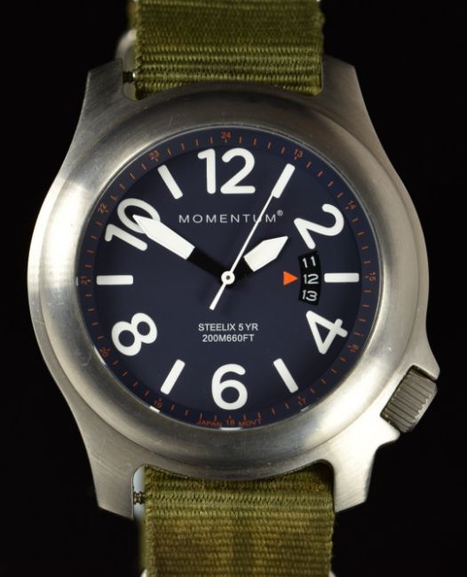 Momentum Steelix CN Series gentleman's wristwatch with date aperture, luminous hands, Arabic numerals and hour markers, black dial, stainless steel case and quartz movement, on green NATO style canvas strap, case diameter 44mm.