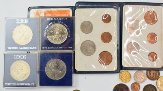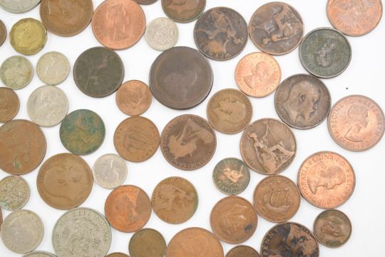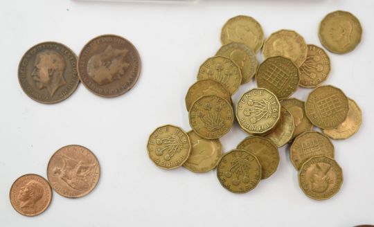 A quantity of UK coinage including WW1 and WW2 era examples, brass threepences including 1946 low mintage example, George III and Queen Victoria copper Heaton Mint pennies 1912 and 1919, modern crowns including Festival of Britain etc