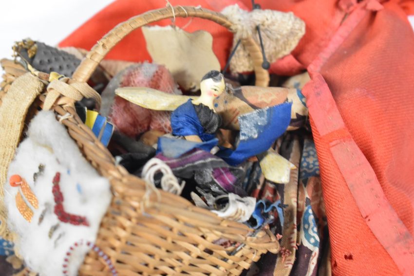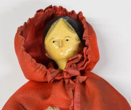 19thC Grodnertal painted wooden Eastern pedlar doll wearing a red cloak and a basket with her wares including a miniature Grodnertal peg doll, height 27.5cm
