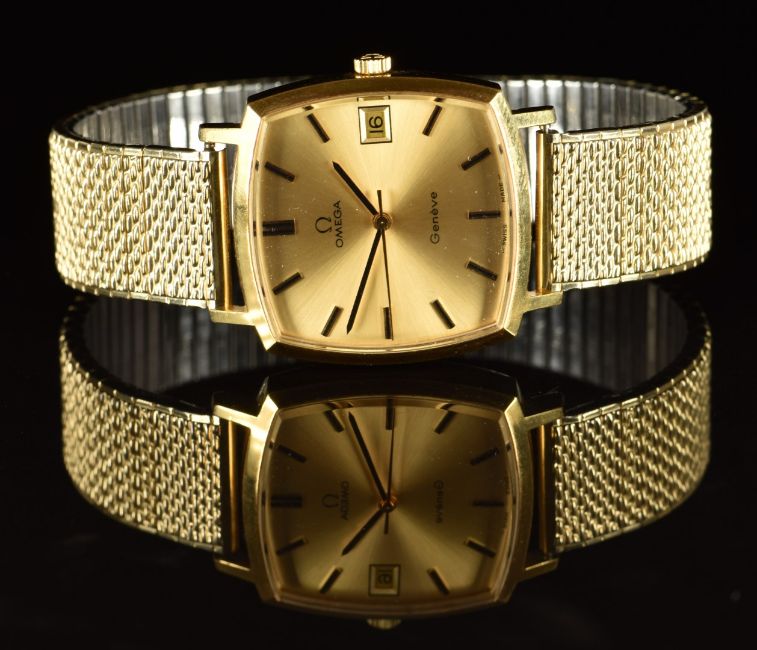Omega gentleman's wristwatch ref. 132.0052 with date aperture, black hands, gold and black baton hour markers, gold dial, gold plated case and signed calibre 1030 movement, on expanding gold plated bracelet, case width 31mm, serial number 35824900, in original box.