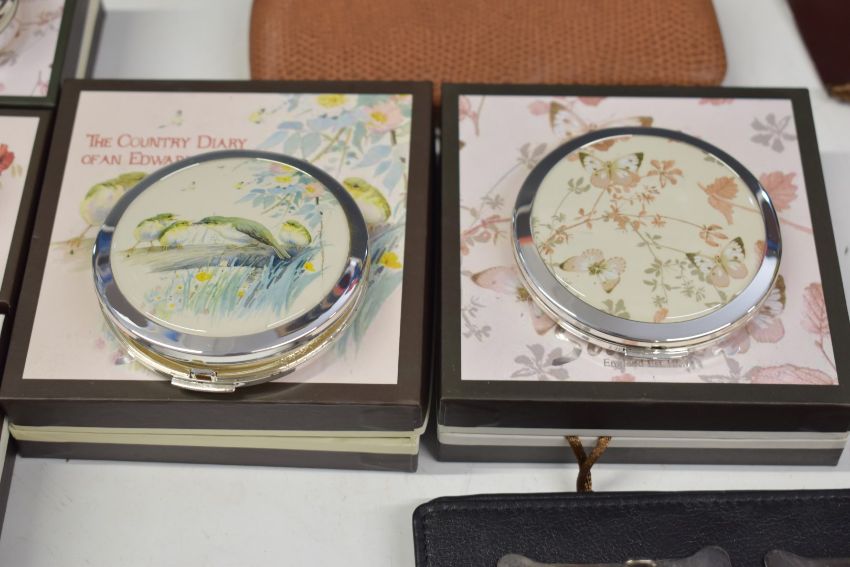 Collection of boxed Stratton compacts, pill boxes and point of sale stands, some from the Diary of an Edwardian Lady range together with a collection of unused Jensen fine leather wallets, organisers, spectacle case etc, some boxed