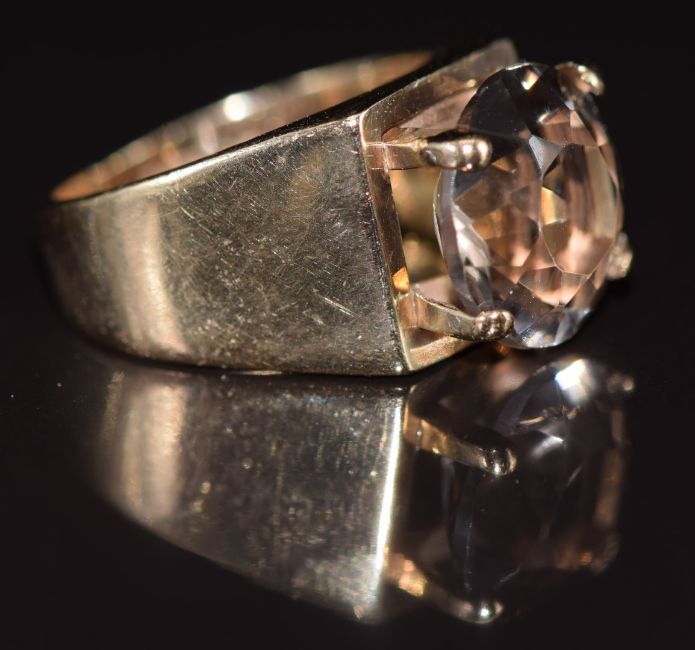 A 9ct gold ring set with a round cut smoky quartz, 4.6g, size F
