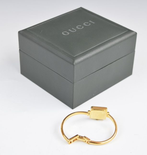 Gucci ladies wristwatch ref. 1900 L with gold hands, white dial, gold plated case and quartz movement, on gold plated bangle, case width 18mm, serial number 0016273, in original box