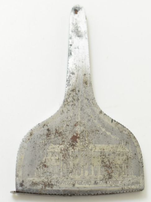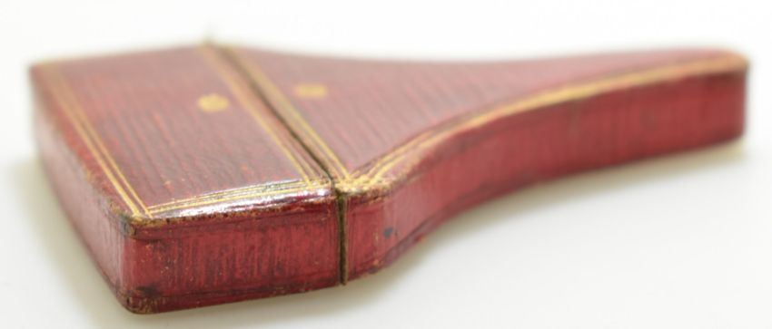 19thC scissors in steel case with Salisbury Cathedral decoration to one side and Stonehenge to the other, with original shaped leather outer case