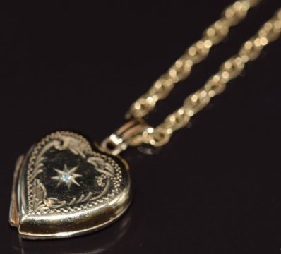 A 9ct gold heart locket set with a diamond, on 9ct gold chain, 9.4g