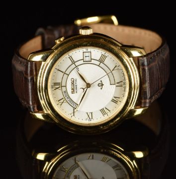 Seiko Kinetic gentleman's wristwatch ref. 5M42-0B49 with date aperture, gold hands and Roman numerals, silver dial, gold plated case and calibre 5M42 movement, on brown leather strap, case diameter 36mm, serial number 090308.
