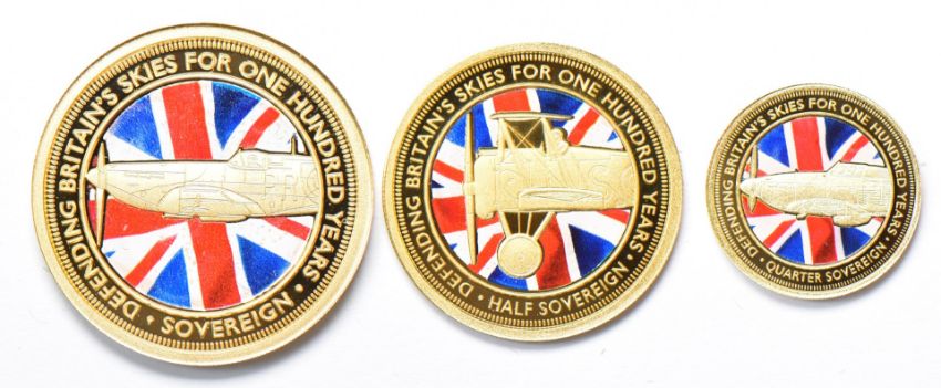 Hattons of London 2018 three coin gold sovereign set commemorating the Defence of Our Skies comprising full sovereign, half sovereign and quarter sovereign examples decorated with a coloured flag design, in deluxe case with certificate