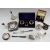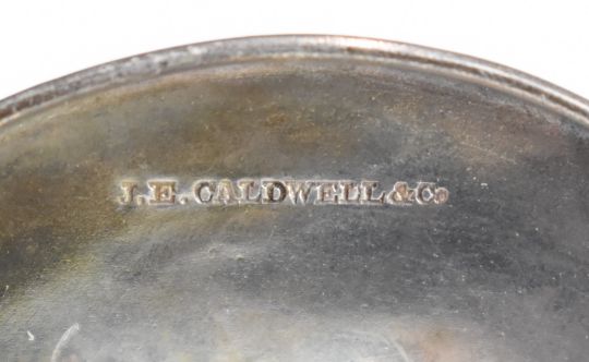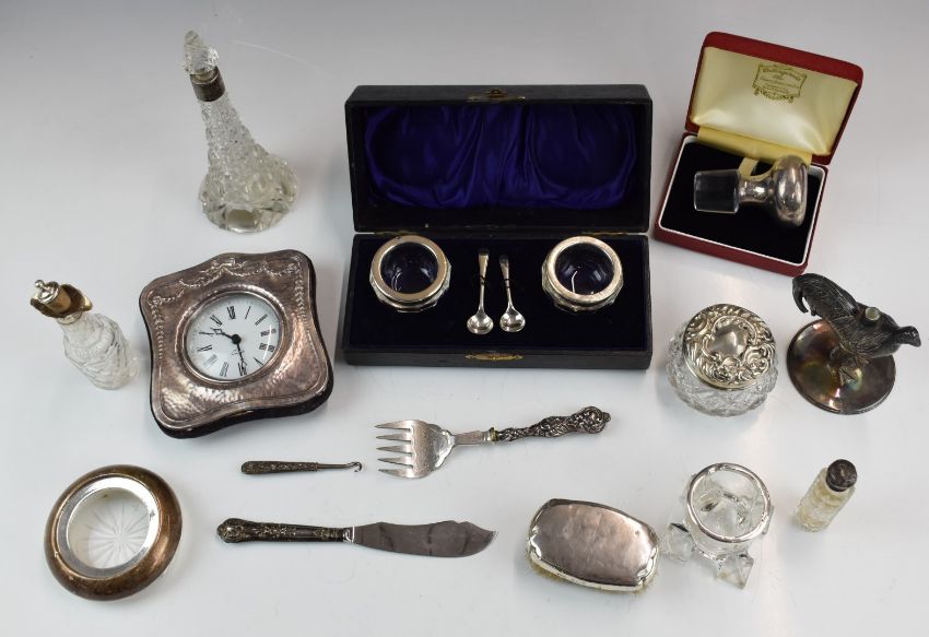 Hallmarked silver mounted items to include cased pair of glass salts, clock, dressing table bottles and a cockerel marked J E Caldwell & Co., likely of Philadelphia, height 7.5cm