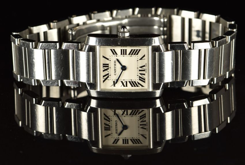 Cartier Tank Francaise wristwatch ref. 2384 with blued hands, black Roman numerals, silver dial, stainless steel case and quartz movement, on stainless steel bracelet, case width 20mm, serial number 779926UF.