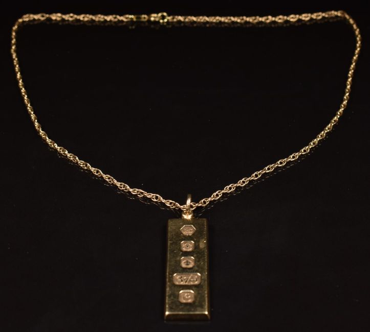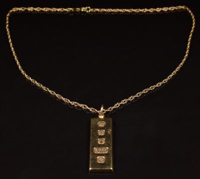 A 9ct gold ingot on 9ct gold chain, 19.9g